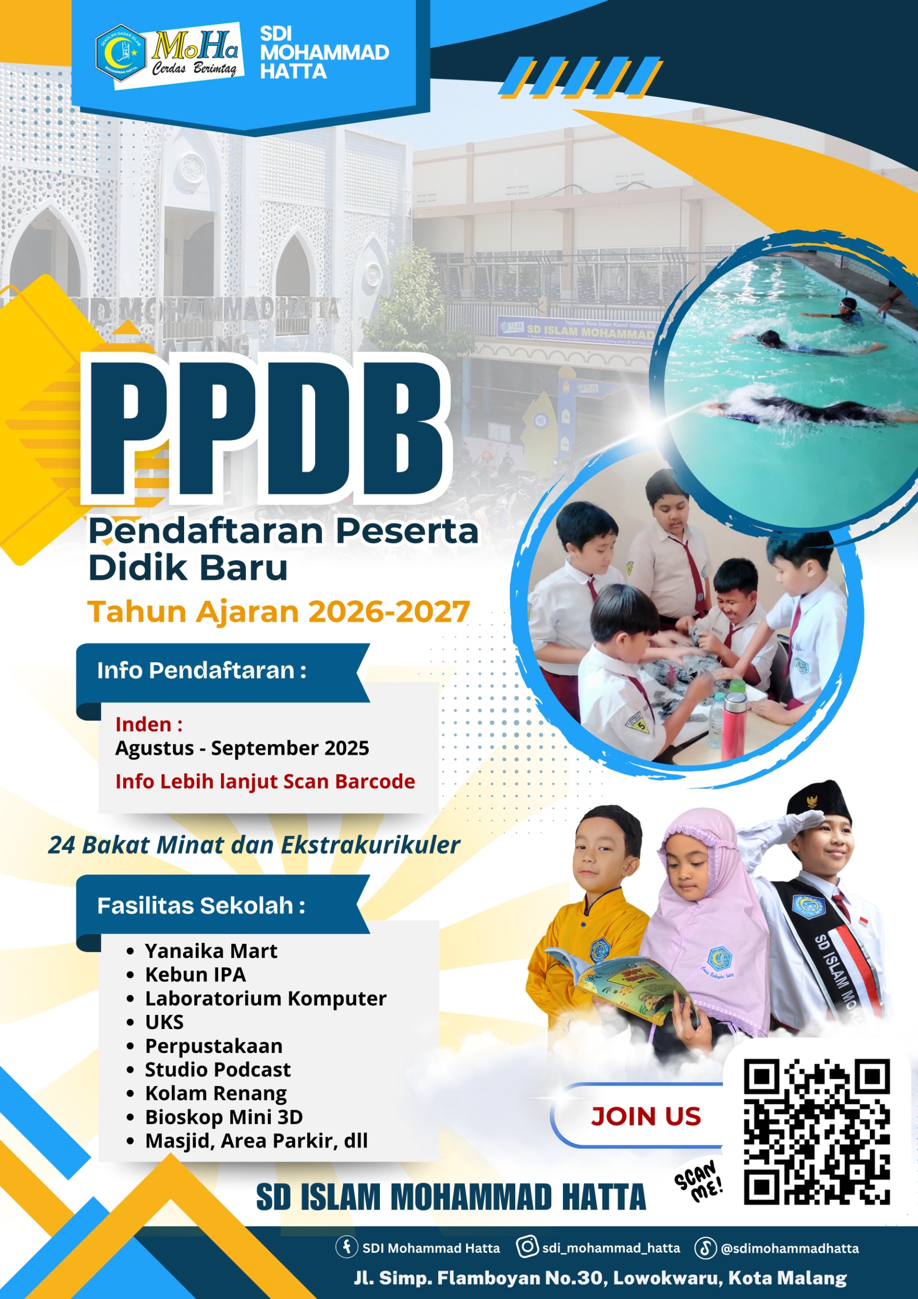SD Islam Mohammad Hatta kembali membuka Penerimaan Peserta Didik Baru (PPDB) di Tahun Pelajaran 2026/2027. Pendaftaran dibuka mulai tanggal 19 Agustus 2025. Pendaftaran dilakukan secara online melalui link berikut : psb.sdimohammadhatta.sch.id